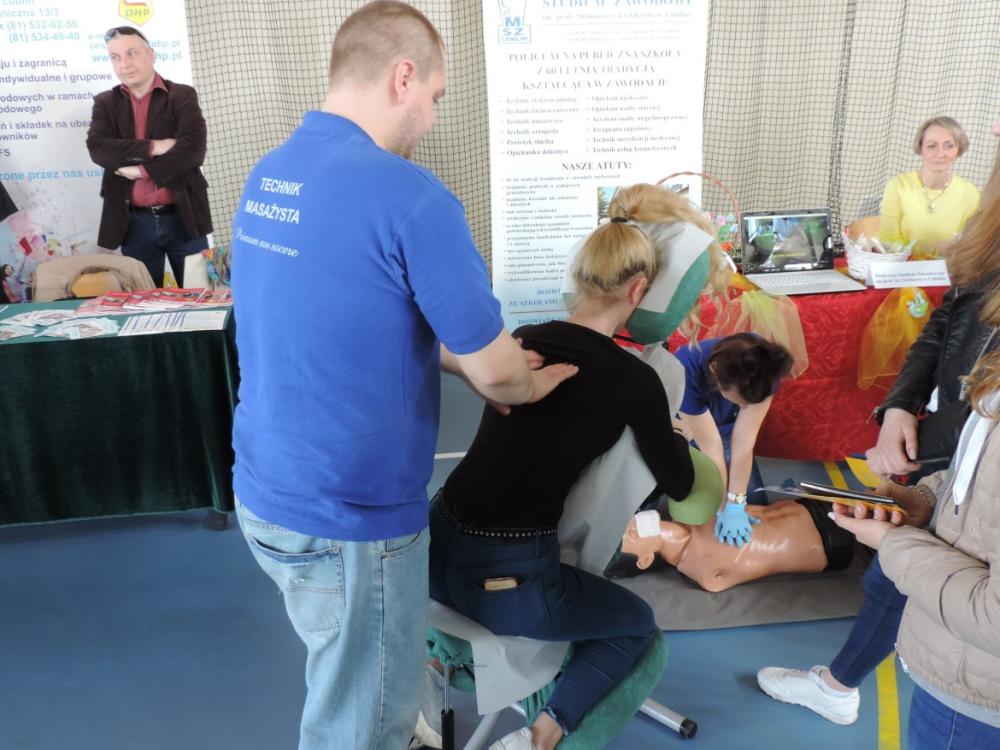Po zapoznaniu się z ofertą edukacyjną i szkoleniową, uczniowie wraz z nauczycielami wzięli udział w warsztatach zatytułowanych ,,Otwartość na innowacyjne działania – jako sposób poruszania się po rynku pracy", które poprowadzili doradcy zawodowi Powiatowego Urzędu Pracy w Świdniku. Na spotkaniu wskazano trendy rynku pracy w XXI wieku. Ponadto zaprezentowano przykłady działań innowacyjnych na rynku pracy i kreatywnych pomysłów prowadzenia działalności gospodarczej. Uczniowie mieli również możliwość udziału w pokazach pierwszej pomocy przedmedycznej zorganizowanych przez Powiatowe Centrum Edukacji Zawodowej w Świdniku i Medyczne Studium Zawodowe im. Prof. Stanisława Liebharta w Lublinie.