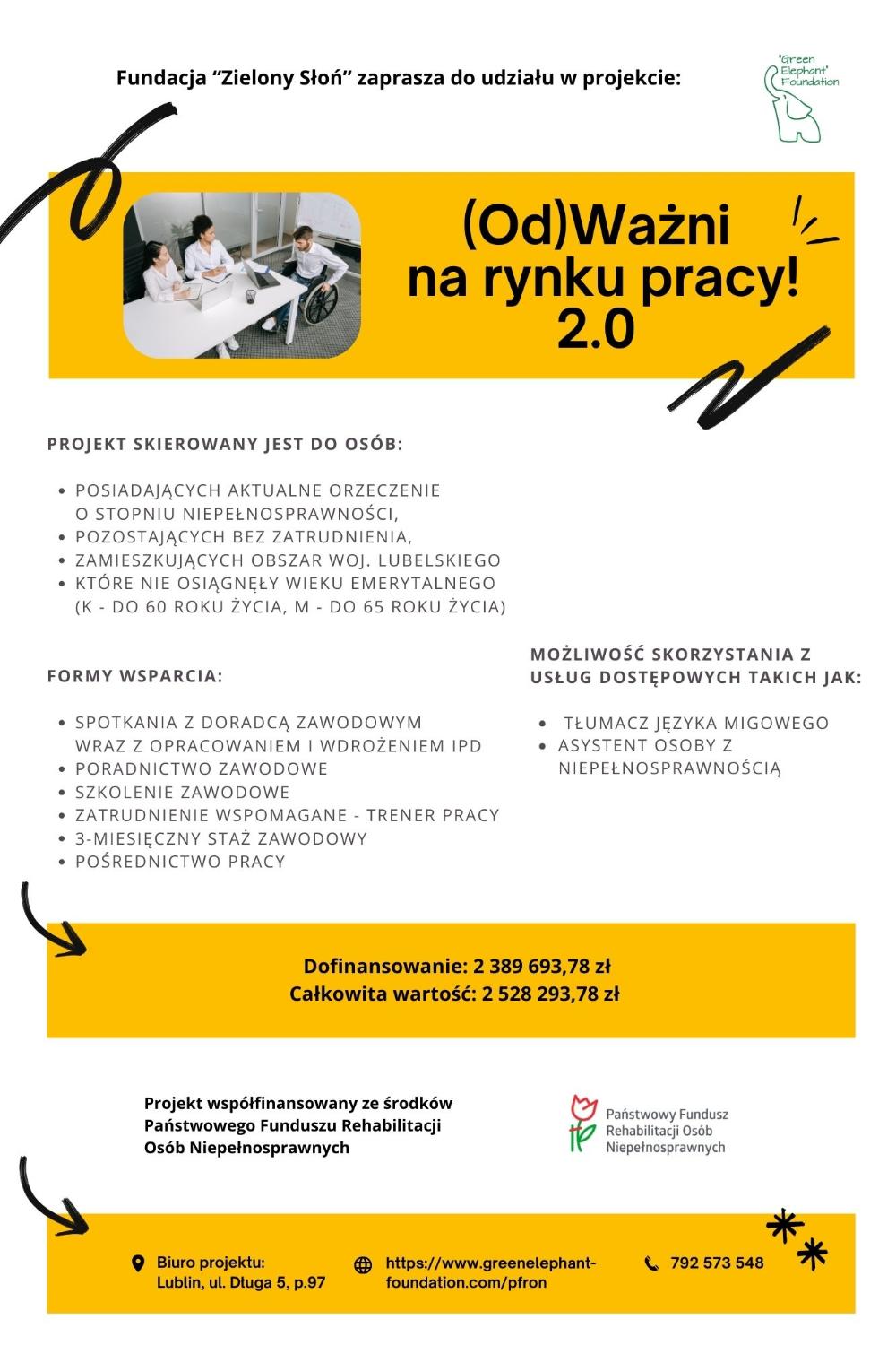 Fundacja „Zielony Słoń” zaprasza do udziału w projekcie „(Od)Ważni na rynku pracy! 2.0”, realizowanego na podstawie umowy z Państwowym Funduszem Rehabilitacji Osób Niepełnosprawnych.